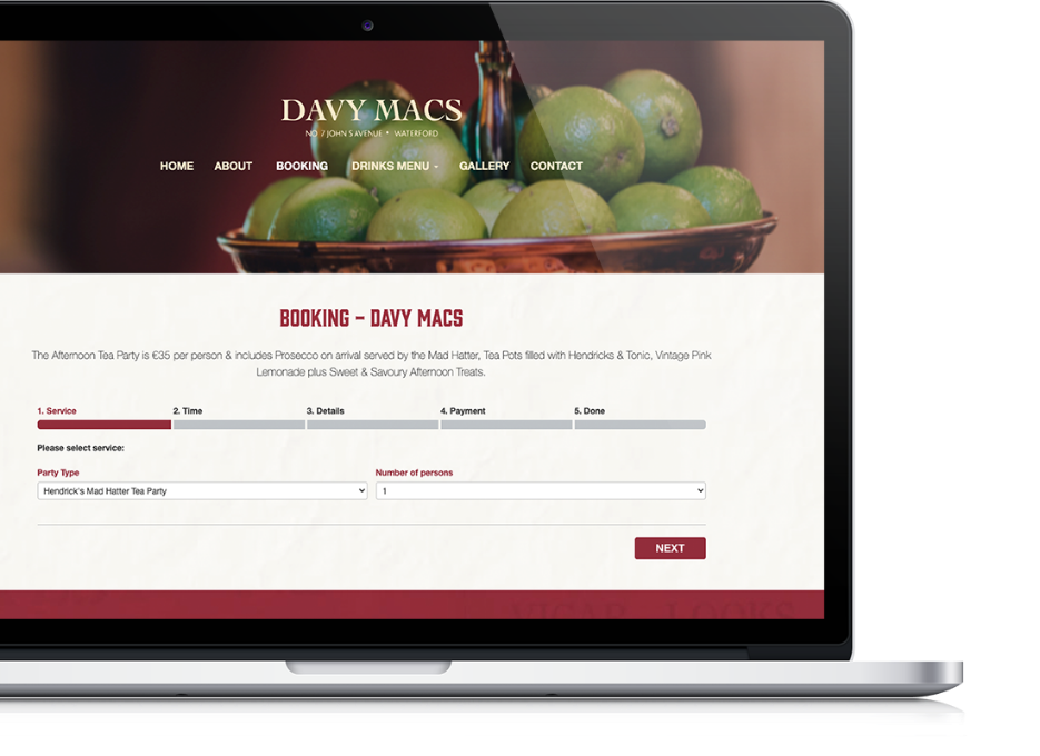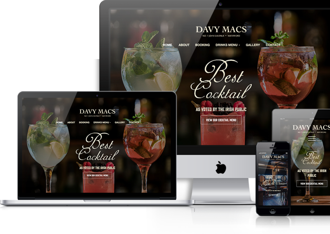 Davy macs is a unique bar with a large variety of gins & themed parties that required a suitable unique approach to promote them online. We were up to the challenge & really enjoyed the design process in order to represent their character in web format.